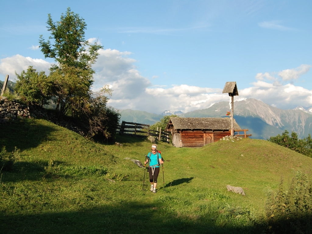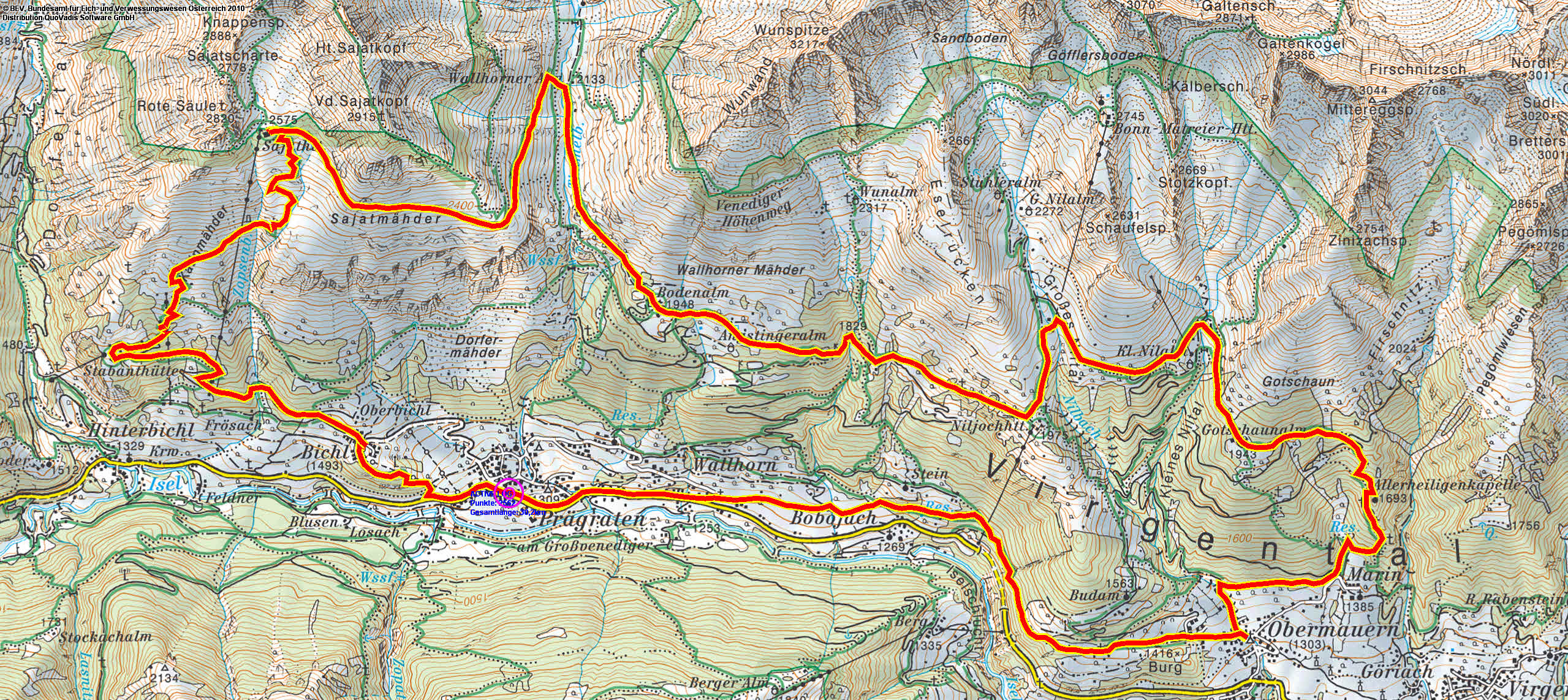 TVB-Infobüro Prägraten – Gehsteig zum Replerbichlerhaus – Bichele – Bichl – Allerheiligenkapelle – Stabanthütte – durch die Höhlen – Katinweg Sajathütte – Prägratner Höhenweg – Fenster – Timmeltal – Bodenalm – Nilljochhütte – Schmiedleralm – Gotschaunalm – Allerheiligenkapelle – Alter Kreuzweg – Parkplatz Marin – Hohe Bank – Bobojach – Blaserhof – Allerseelenkapelle – St. Andrä – TVB Infobüro Prägraten (30 km)