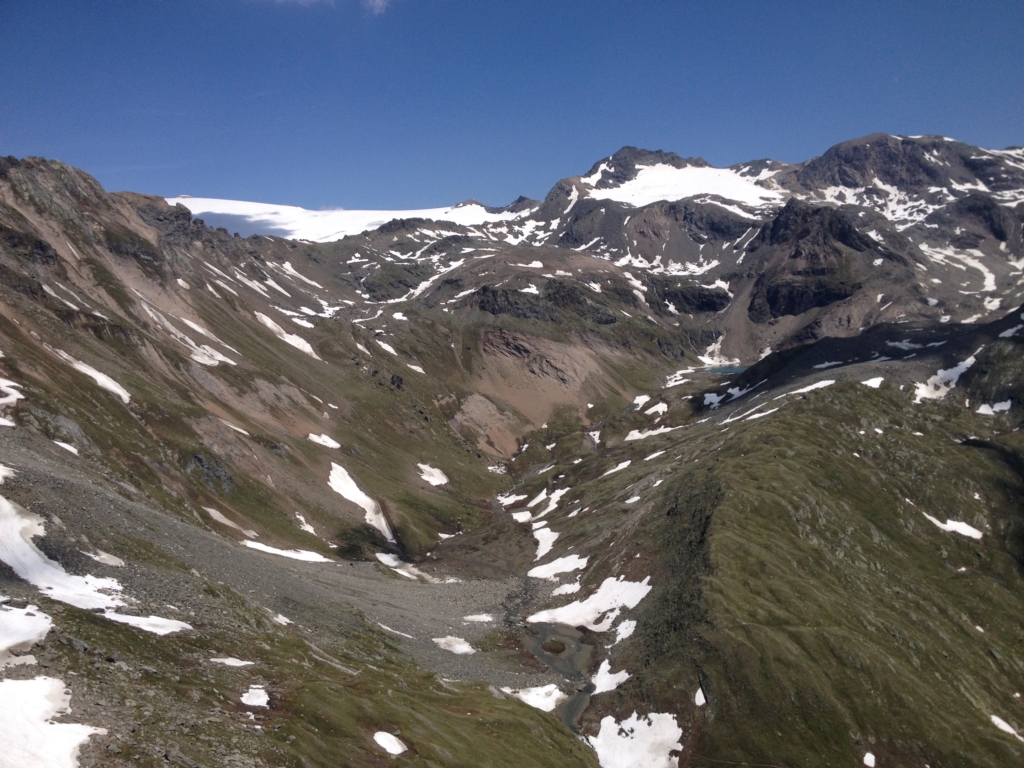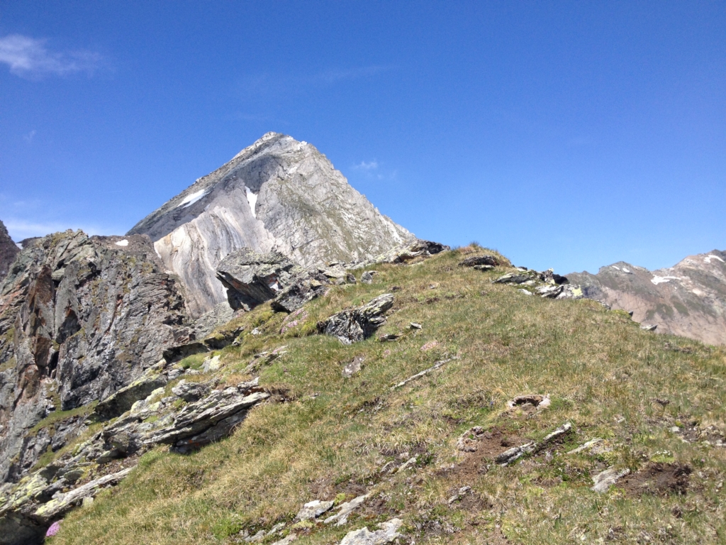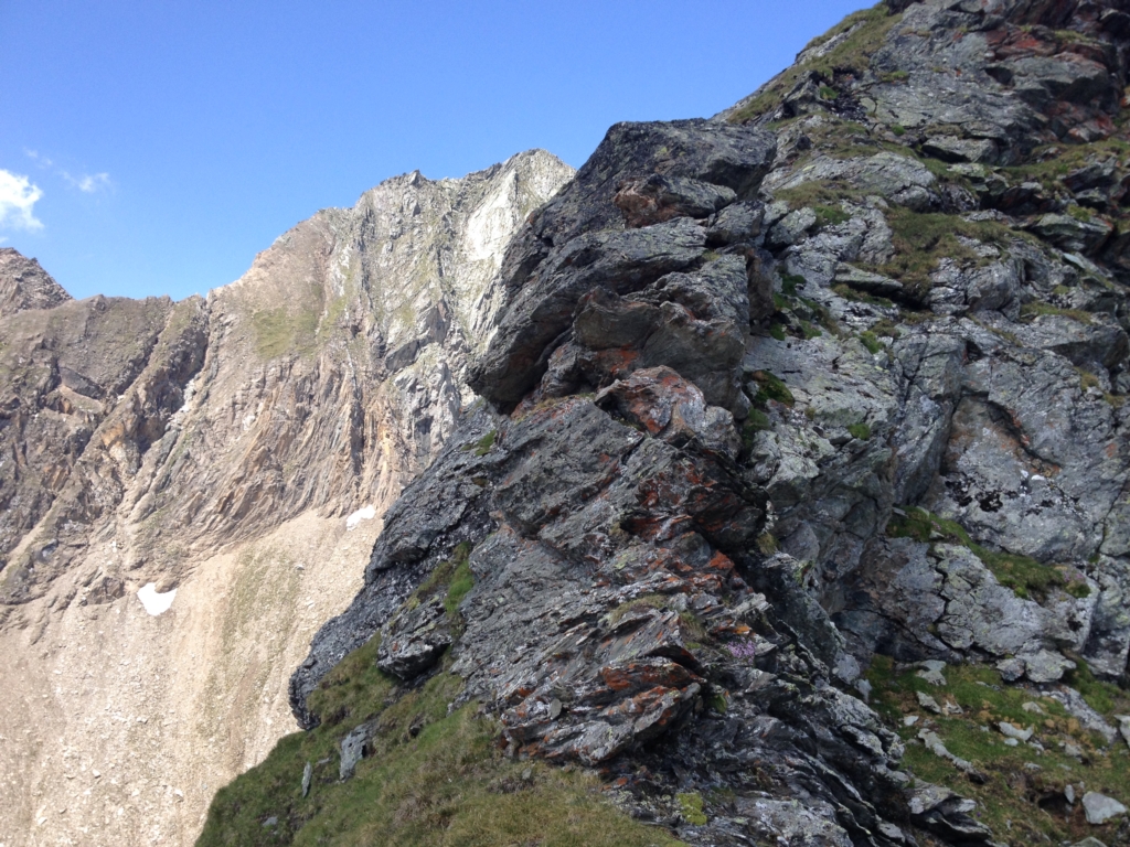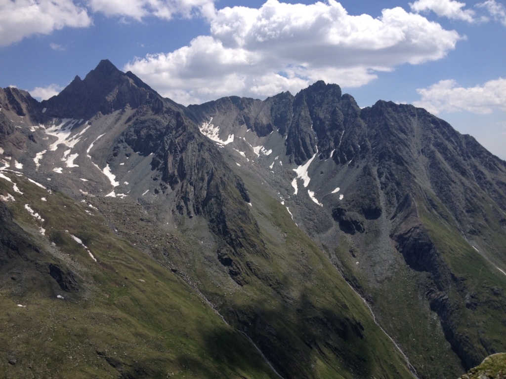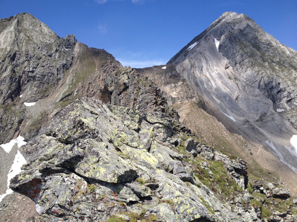 Wenn man in das Timmeltal hineingeht, dann ist mir auf der linken Seite immer schon ein Berg aufgefallen, der keinen Namen trägt. Man bemerkt zwar im Hintergrund die Zopatspitze, aber dieser Gipfel wird von niemanden beachtet. Daher habe ich mich gestern mit Angelika auf den Weg gemacht und ihn bestiegen. Man ist nahe an der Zopatspitze, Eissee und Weißspitze, gegenüber ragen die dominanten Gipfel des Hexenkopfes, des Hohen Eichams und der Wunspitze empor. Ich hatte zwar meine Nikon D3200 mit dabei, jedoch ohne Strom, daher konnte ich die Bilder nur mit meinem Handy machen.